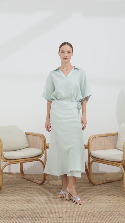 The Blue Dust Breeze set features a beautifully crafted top and a versatile wrap skirt designed to flatter various body types. Made from 100% linen, it offers breathability and comfort, making it perfect for day or night. The soft blue hues evoke tranquility, while the handmade design ensures a unique touch. Effortlessly dress it up or down for any occasion.