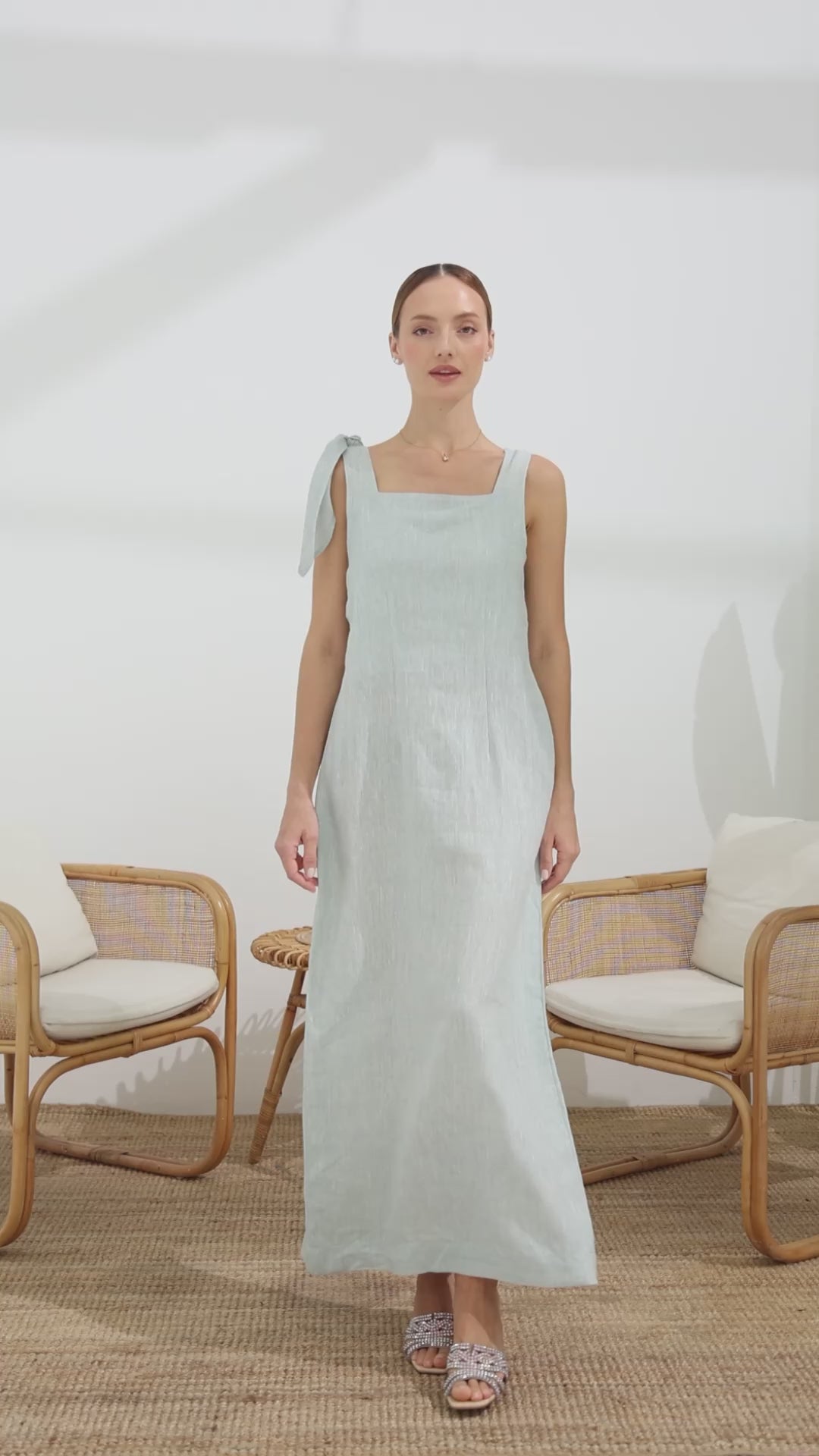 The Blue Dust Breeze sleeveless dress showcases a flattering fit that suits various body types. Crafted from 100% linen, it offers breathability and comfort, making it perfect for day or night. The soft blue hues evoke tranquility, while the charming bow detail on one shoulder adds a unique touch. Handmade upon order, this dress can be effortlessly dressed up or down for any occasion.