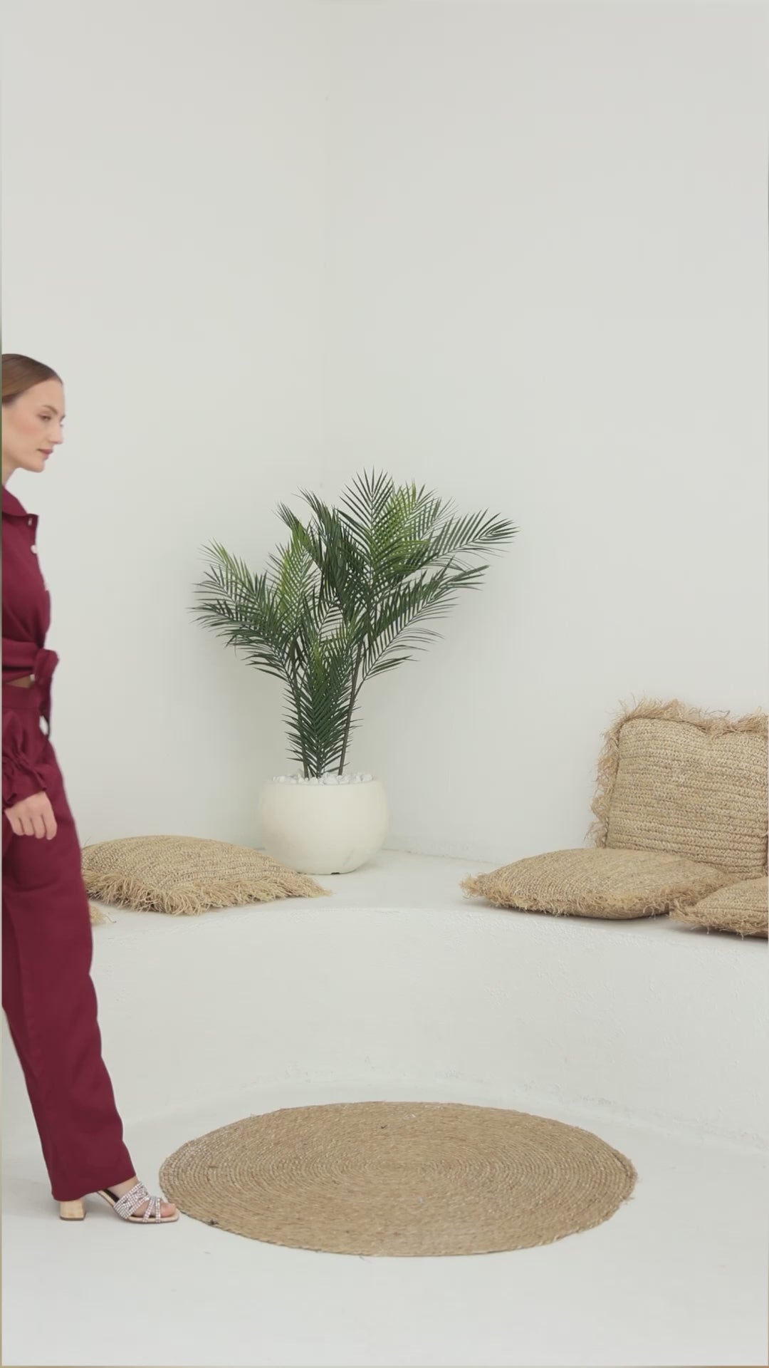 The Sunset Breeze set in deep burgundy is crafted from 100% breathable linen, offering a perfect blend of elegance and comfort. The relaxed-fit top features flowing bell sleeves and unique water lily-shaped buttons for a delicate, nature-inspired detail. Paired with tailored pants, this set creates a sleek yet breezy silhouette, ideal for any time of the day.