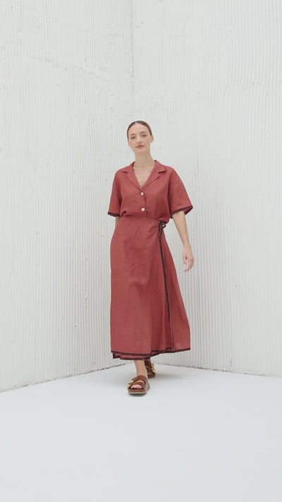 The Terracotta Set features a tailored top adorned with elegant golden buttons and pearl accents, paired with a stylish wrap skirt. Crafted from 100% linen with rich brown velvet detailing along the edges, this ensemble offers a flattering fit that hugs the body beautifully. The warm terracotta hue captures the essence of fall, making it a perfect addition to your seasonal wardrobe.