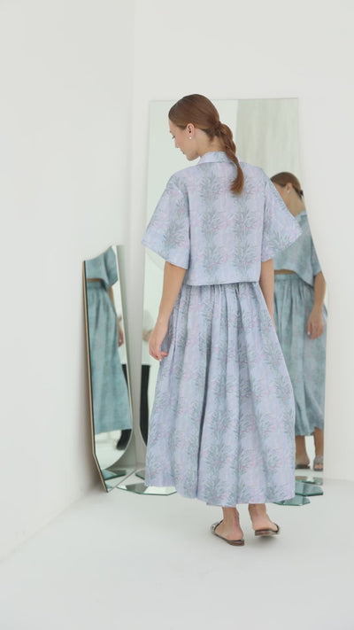 The Garden Breeze set is a chic two-piece ensemble, perfect for summer. Crafted from 100% pure printed linen, it features a stylish cropped top and a flowing skirt. Unique water lily-shaped buttons add a charming touch, while the violet hues create a vibrant and elegant look. Designed to flatter various body types, this versatile set transitions seamlessly from day to evening wear, making it ideal for any occasion.